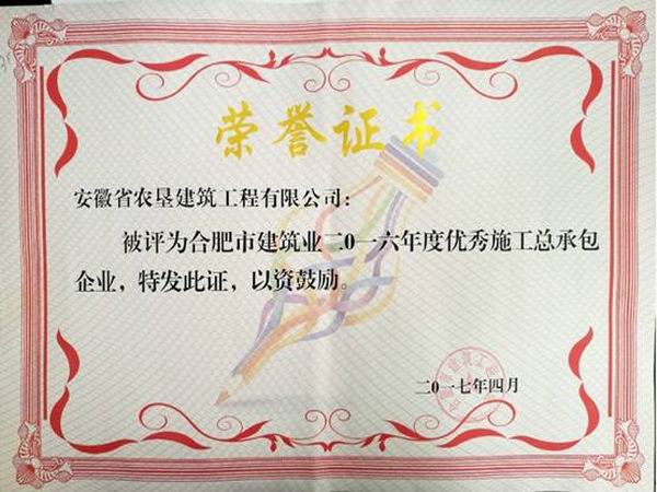 近日,垦建公司荣膺“合肥市建筑业2016年度优秀施工总承包企业”称号。这是垦建公司连续第四年获此殊荣。