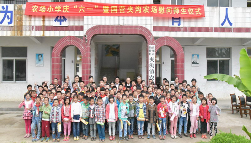5月28日,夹沟农场党委副书记、关工委主任夏长信带队到小学慰问,送去学习用品,并祝小朋友们“六一”节快乐。