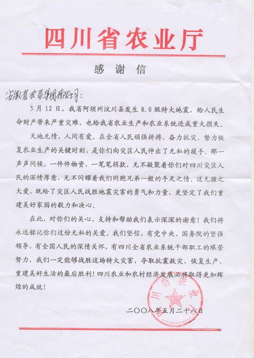四川省农业厅致安徽省农垦集团公司感谢信