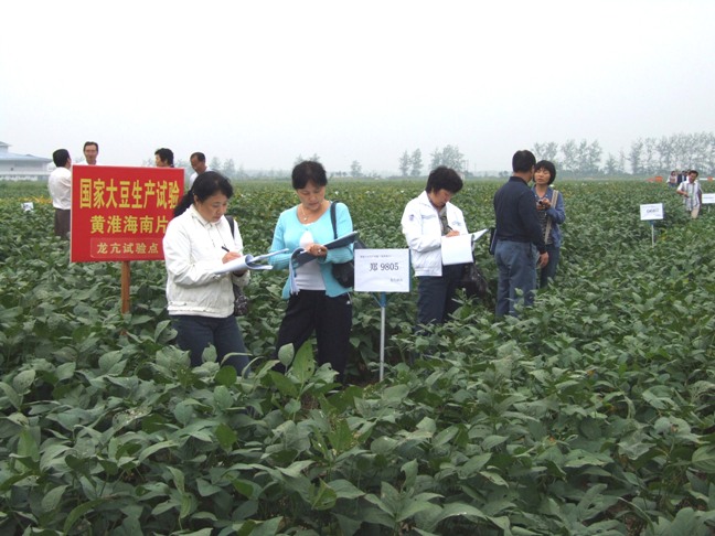 考察团一行深入国家大豆区域试验龙亢农场试验基地,实地查看了大豆品种展示、试验质量,详细记录每个大豆品种表现情况和田间评价。