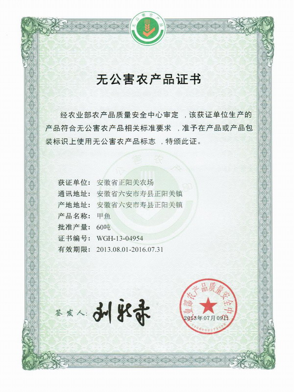 日前,安徽农垦正阳关农场养殖的“正艳”牌甲鱼,通过农业部农产品质量安全中心审定,被认定为无公害农产品,获得了“无公害农产品证书”和“无公害农产品产地认定证书”。