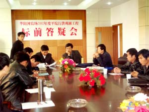 为抓紧落实2002年度平垸行洪巩固工程施工前的各 项准备工作,华阳河农场委托安徽省水利厅所属的 金晨水利招投标公司对本期三座进退洪闸进行施 工、监理招投标,并开2005年11月15日召开了标前 答疑会。答疑会前,项目施工、监理招投标公告分 别在安徽水利招标网等5家网站上发布。15日上 午,招标代理单位、设计单位及农场组织了13家资 格预审合格的施工单位到施工场地进行了踏勘,并 在答疑会上就有关问题给予了解答。本期工程将于 11月30日在安徽省水利宾馆进行现场开标。(图为 答疑会现场)